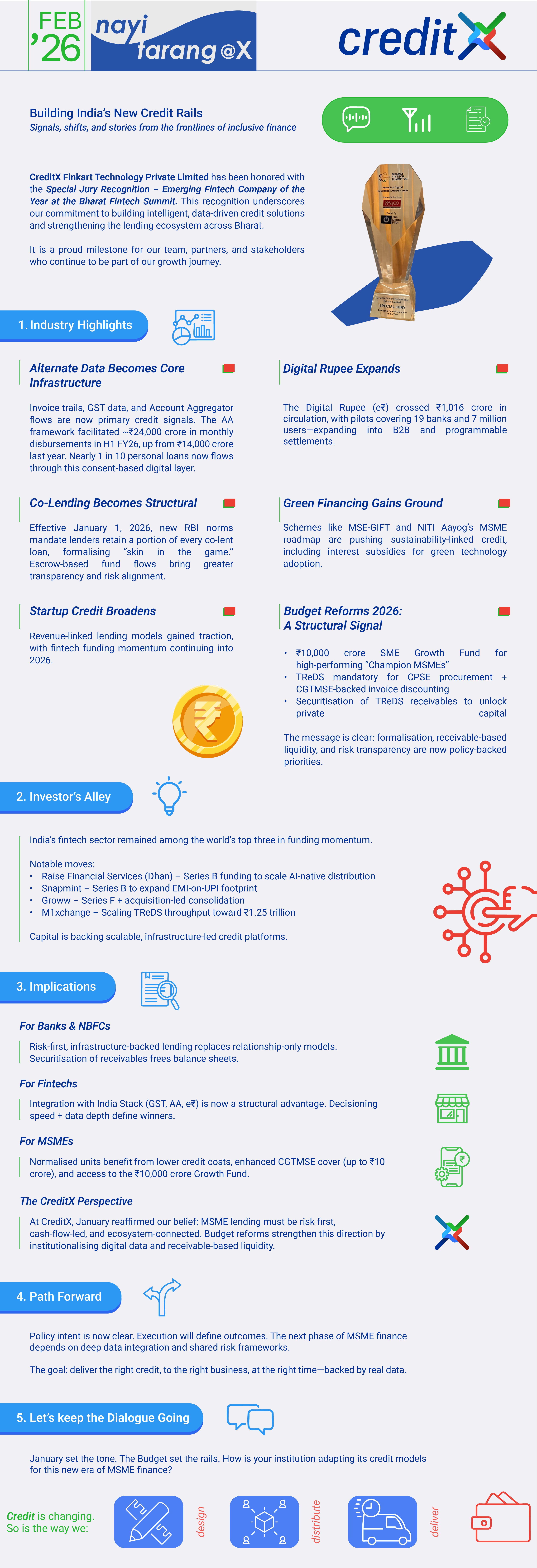 In this edition of Nayi Tarang @X, we decode what moved during the month, how the Budget reforms reinforce these shifts, and what it means for MSMEs, NBFCs, banks, and fintech platforms shaping the next phase of credit.